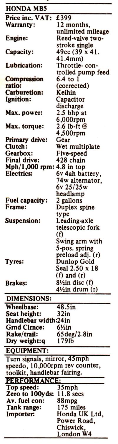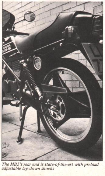True, it can still only just manage the mandatory top speed of around 35mph. In fact the MB5 can be beaten off the mark by some single or two speed mopeds. But that is of little consequence. For in the case of the Honda looks are all. And if looks are the criterion, then the MB5 is a high performance bike.