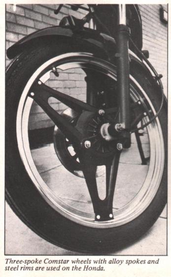 The tyres are mounted on yet another type of Honda Comstar wheel. Since the bike is relatively light, these have just three pairs of pressed alloy spokes riveted to chromed steel rims and bolted to hubs.